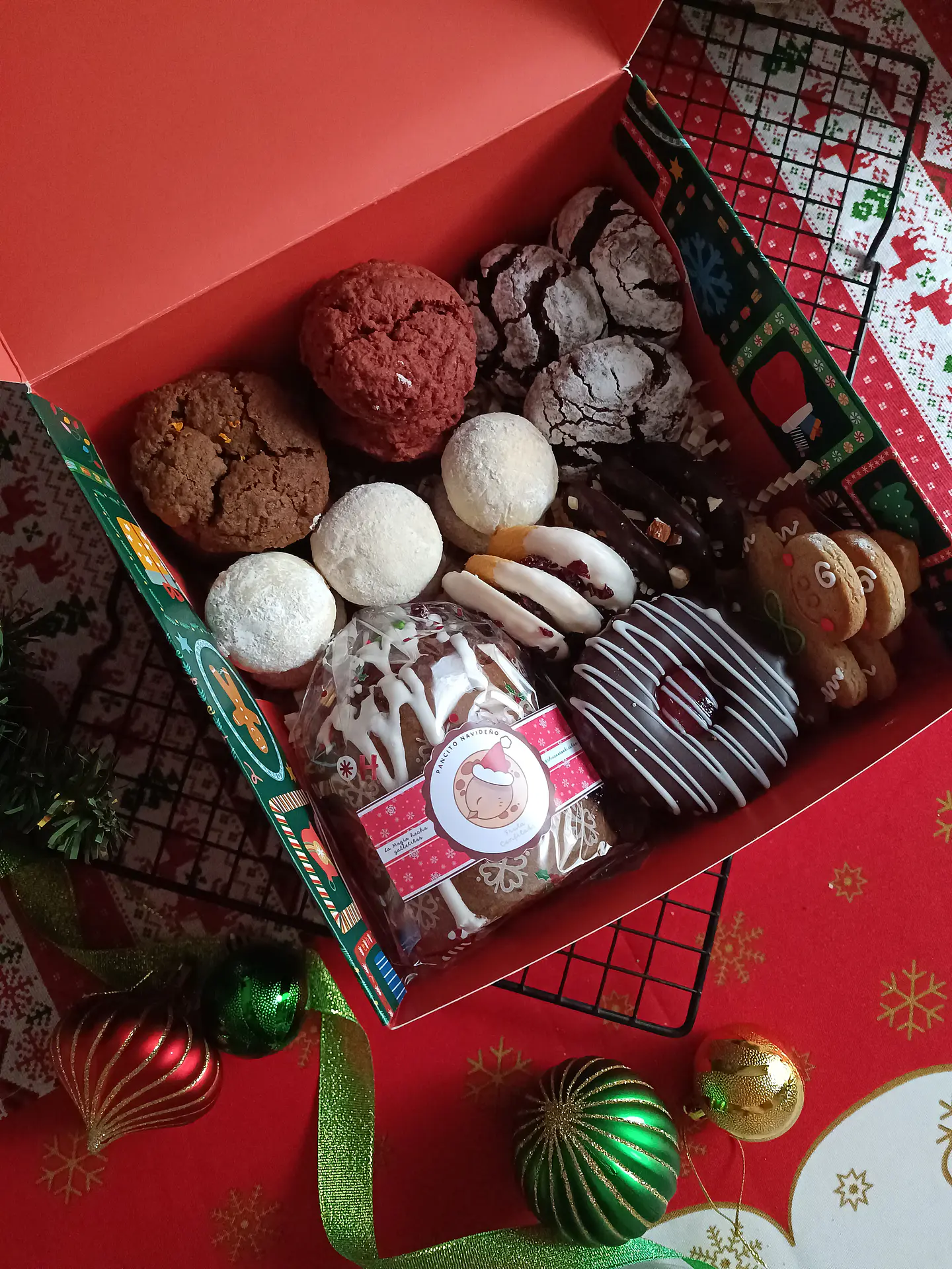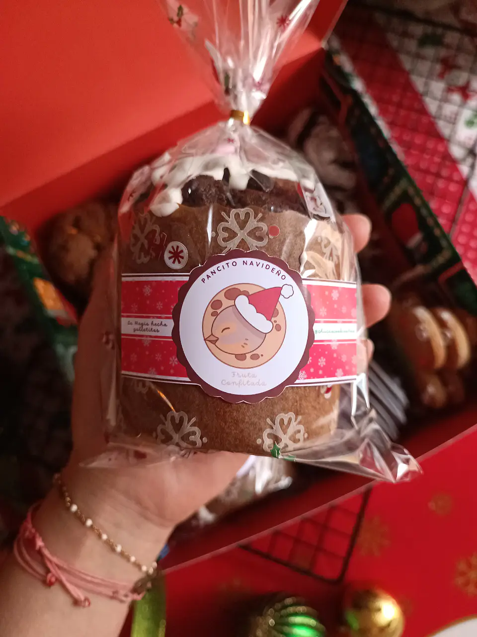 - Pancito Navideño: Un esponjoso pan con fruta confitada, almendras y nueces, perfecto para acompañar las galletas o disfrutar solo en cualquier momento. Peso Aprox. 200gr.